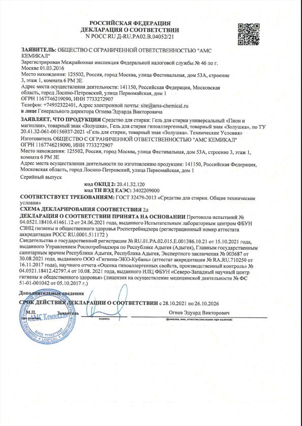 Гель для стирки гипоаллергенный "Золушка" 1,2л